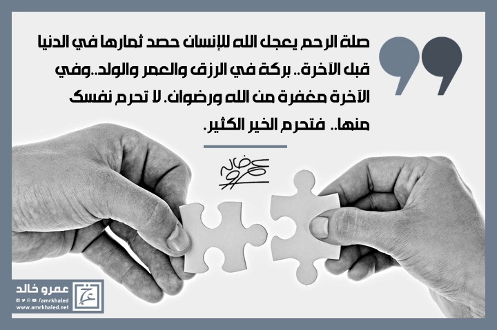 amrkhaled "صلة الرحم يعجل الله للإنسان حصد ثمارها في الدنيا قبل الآخرة.. بركة في الرزق والعمر والولد..وفي الآخرة مغفرة من الله ورضوان. لا تحرم نفسك منها.. فتحرم