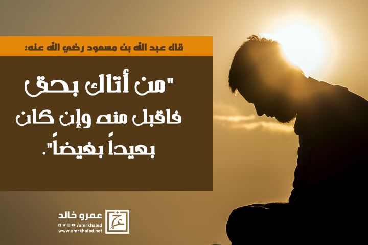 amrkhaled عبدالله بن مسعود : عليك بقبول الحق ولو جاء من خصم بغيض قال عبد الله بن مسعود رضي الله عنه: "من أتاك بحقٍّ فاقبل منه وإن كان بعيداً بغيضاً".