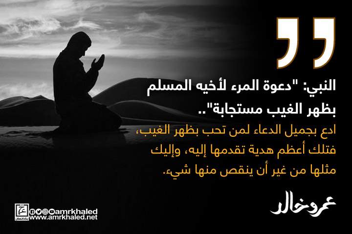 الدعاء بظهر الغيب مجاب عند الله يوكل الله لمن يدعو ملكا يقول له ولك بمثل؛ فعن أبي الدرداء رضي الله عنه قال: قال رسول اللهِ صلى الله عليه وسلم: (مَا مِنْ عَبْدٍ مُسْلِمٍ يَدْعُو لأَخِيهِ بِظَهْرِ الْغَيْبِ، إِلاَّ قَالَ الْمَلَكُ: وَلَكَ بِمِثْلٍ) رواه مسلم، وفي رواية له عن أبي الدرداء مرفوعاً: (مَنْ دَعَا لأَخِيهِ بِظَهْرِ الْغَيْبِ، قَالَ الْمَلَكُ الْمُوَكَّلُ بِهِ: آمِينَ، وَلَكَ بِمِثْلٍ).
