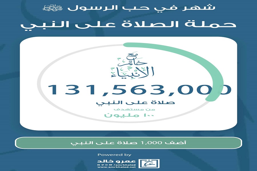 تجاوز عدد المشاركات في حملة الصلاة على النبي صلى الله عليه وسلم، التي أطلقها الدكتور عمرو خالد، الداعية الإسلامي، أكثر من 130 مليون صلاة، في غضون ثلاثة أيام من إطلاقها.