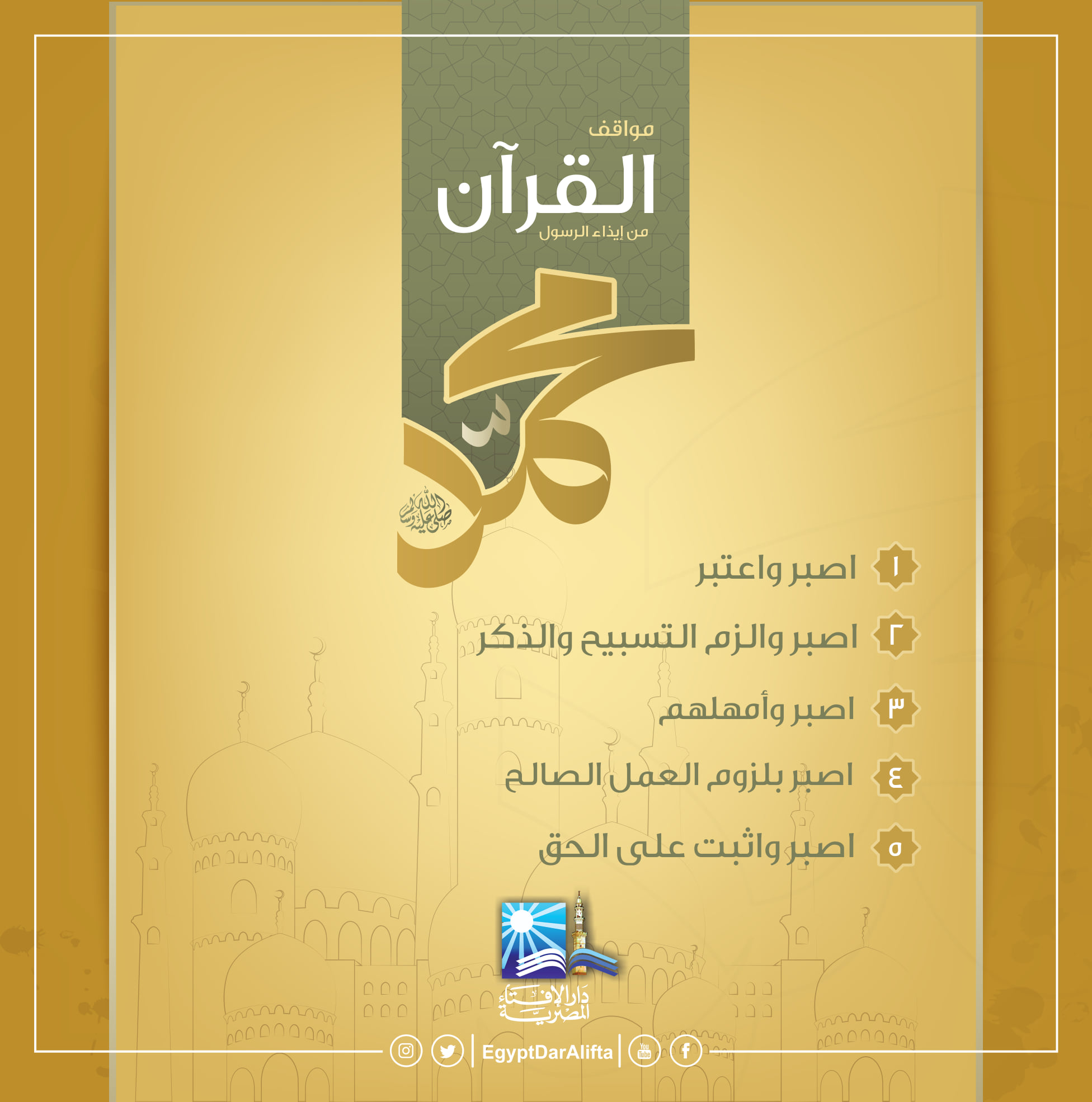 الدار استدلت علي ان الرسول كان سيصبر ويعتبر ضد هذه الإساءات الممنهجة بقوله تعالي:فَاصْبِرْ كَمَا صَبَرَ أُولُو الْعَزْمِ مِنَ الرُّسُلِ وَلَا تَسْتَعْجِلْ لَهُمْ كَأَنَّهُمْ يَوْمَ يَرَوْنَ مَا يُوعَدُونَ لَمْ يَلْبَثُوا إِلَّا سَاعَةً مِنْ نَهَارٍ بَلَاغٌ فَهَلْ يُهْلَكُ إِلَّا الْقَوْمُ الْفَاسِقُونَ} [الأحقافالأية 35