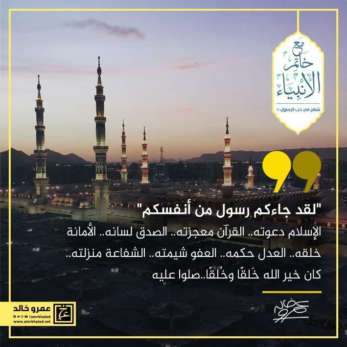 "(لقد جاءكم رسول من أنفسكم).. الإسلام دعوته.. القرآن معجزته.. الصدق لسانه.. الأمانة خلقه.. العدل حكمه.. العفو شيمته.. الشفاعة منزلته.. كان خير الناس خَلْقاً وخُلُقاً.. صلوا عليه"
