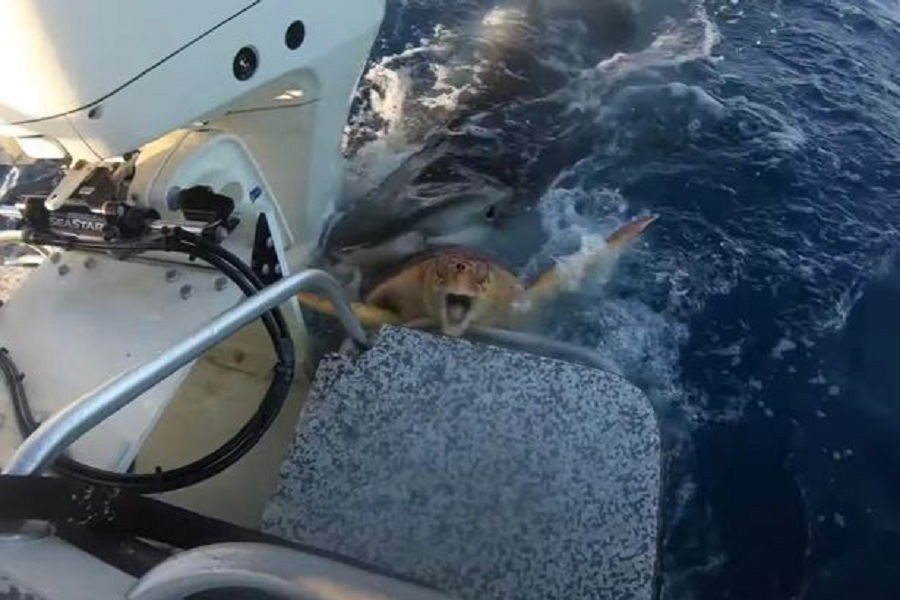 وعندما ينعطف القرش إلى اليسار، تتمكن السلحفاة من التحرر وتطفو في الماء قبل أن يمسكها الصيادان وينقلانها إلى مكان أكثر أمانًا.