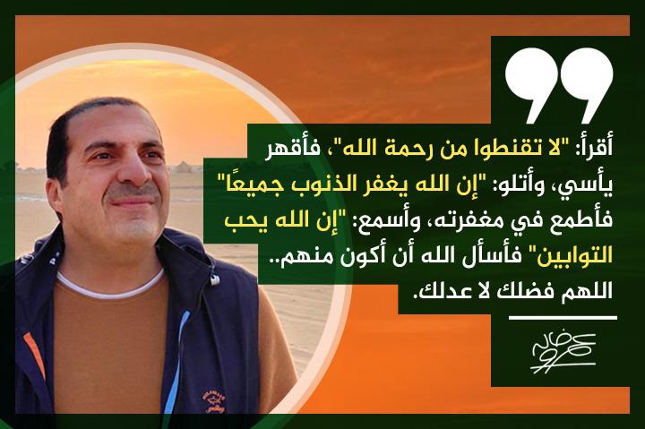 "أقرأ: {لا تقنطوا من رحمة الله}، فأقهر يأسي، وأتلو: {إن الله يغفر الذنوب جميعًا} فأطمع في مغفرته، وأسمع: {إن الله يحب التوابين}، فأسأل الله أن أكون منهم.. اللهم فضلك لا عدلك".