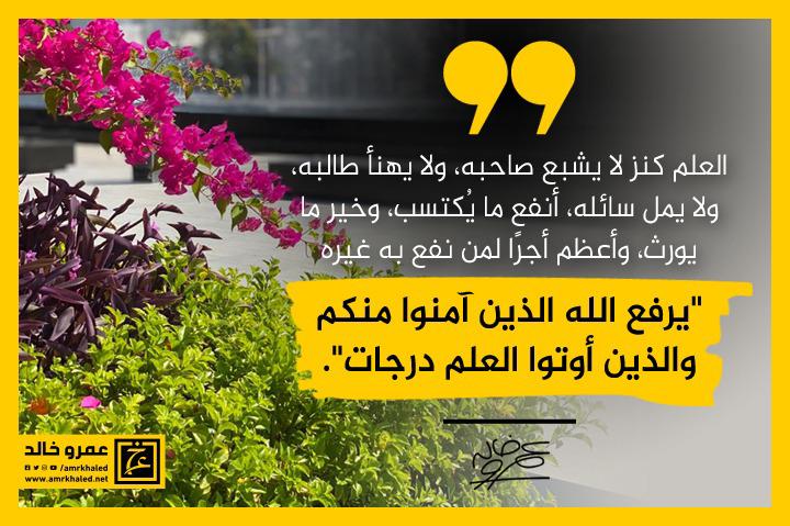 "العلم كنز لا يشبع صاحبه، ولا يهنأ طالبه، ولا يمل سائله، أنفع ما يُكتسب، وخير ما يورث، وأعظم أجرًا لمن نفع به غيره. {يرفع الله الذين آمنوا منكم والذين أوتوا العلم درجات}".