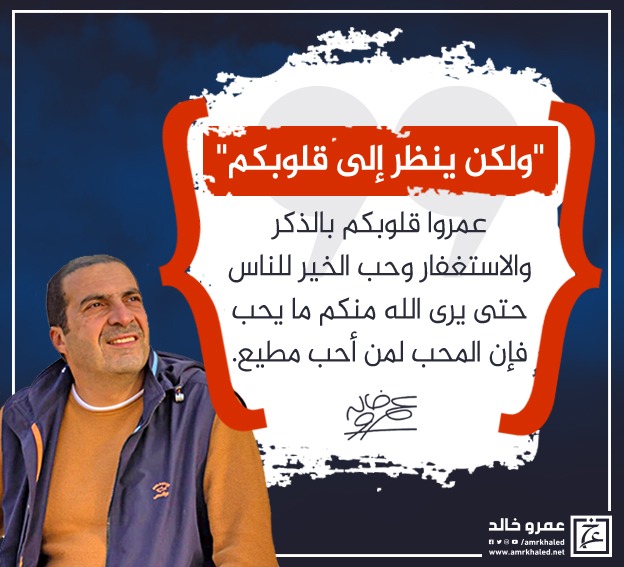 amrkhaled "{ولكن ينظر إلى قلوبكم} عمروا قلوبكم بالذكر والاستغفار وحب الخير للناس حتى يرى الله منكم ما يحب فإن المحب لمن أحب مطيع".