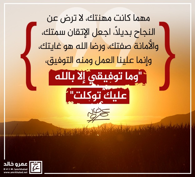 "مهما كانت مهنتك، لا ترض عن النجاح بديلاً، اجعل الإتقان سمتك، والأمانة صفتك، ورضا الله هو غايتك، وإنما علينا العمل ومنه التوفيق، {وما توفيقي إلا بالله عليك توكلت}".