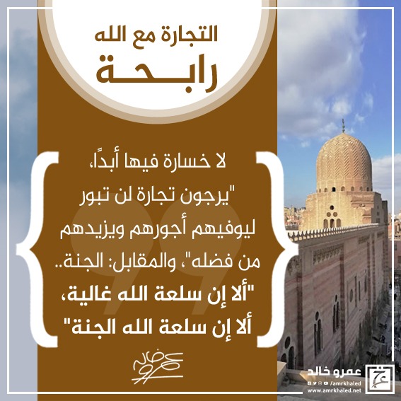 "التجارة مع الله رابحة لا خسارة فيها أبدًا، "يرجون تجارة لن تبور ليوفيهم أجورهم ويزيدهم من فضله"، والمقابل: الجنة.. {إلا أن سلعة الله غالية، إلا أن سلعة الله الجنة}".