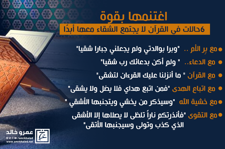 amrkhaled هناك حالات في القرآن لا يجتمع الشقاء معها أبدا اولها مع بر الين والدعاء ومع اتباع تعاليم القرآن ومع اتباع الهدي النبوي ومع خشية الله ومع التقوي التي