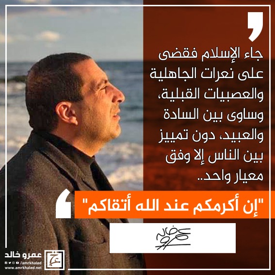 amrkhaled "جاء الإسلام فقضى على نعرات الجاهلية والعصبيات القبلية، وساوى بين السادة والعبيد، دون تمييز بين الناس إلا وفق معيار واحد.. {إن أكرمكم عند الله أتقاكم}