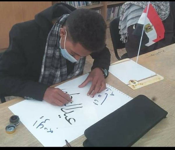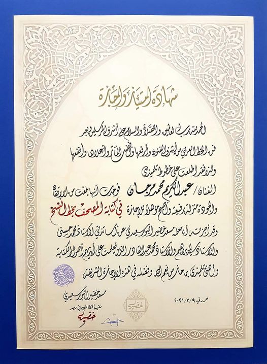 حصل طالب مصري يبلغ من العمر 19 عامًا عامًا على إجازة كتابة المصحف الشريف في خط النسخ من نقيب الخطاطين المصريين خضير البورسعيدي.