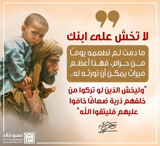 "لا تخش على ابنك ما دمت لم تطعمه يومًا من حرام، فهذا أعظم ميراث يمكن أن تورثه له.. {وليخش الذين لو تركوا من خلفهم ذرية ضعافًا خافوا عليهم فليتقوا الله}".
