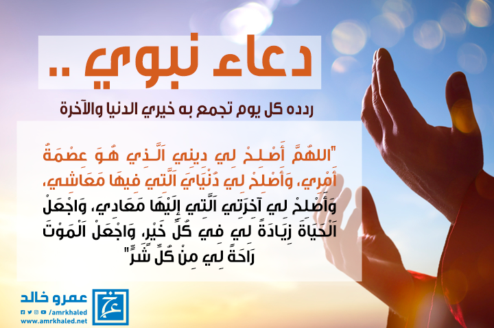 amrkhaled اللهُمَّ أَصْلِحْ لِي دِينِي اَلَّذِي هُوَ عِصْمَةُ أَمْرِي، وَأَصْلِحْ لِي دُنْيَايَ اَلَّتِي فِيهَا مَعَاشِي، وَأَصْلِحْ لِي آخِرَتِي اَلَّتِي إِلَي