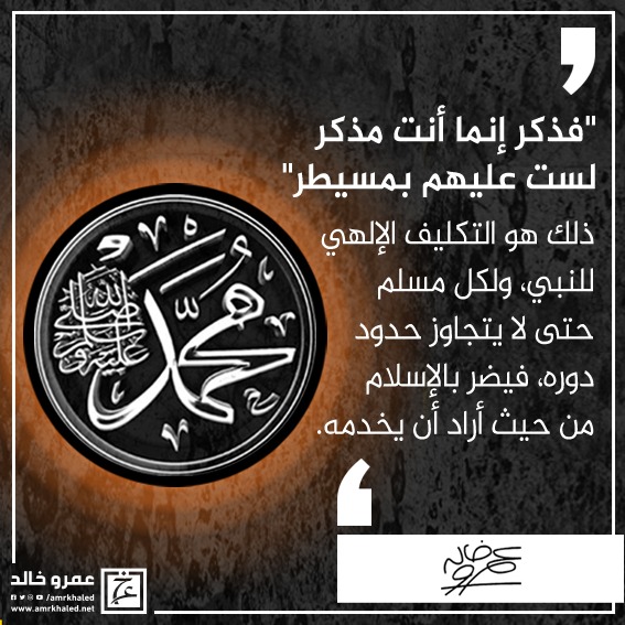 amrkhaled "{فذكر إنما أنت مذكر لست عليهم بمسيطر}، ذلك هو التكليف الإلهي للنبي، ولكل مسلم حتى لا يتجاوز حدود دوره، فيضر بالإسلام من حيث أراد أن يخدمه".