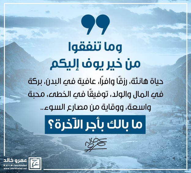 amrkhaled "{وما تنفقوا من خير يوف إليكم}، حياة هانئة، رزقًا وافرًا، عافية في البدن، بركة في المال والولد، توفيقًا في الخطى، محبة واسعة، ووقاية من مصارع السوء..