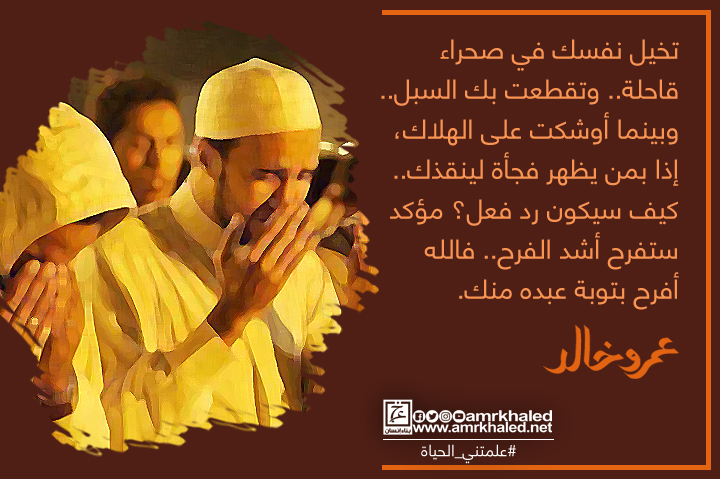 "تخيل نفسك في صحراء قاحلة.. وتقطعت بك السبل.. وبينما أوشكت على الهلاك، إذا بمن يظهر فجأة لينقذك.. كيف سيكون رد فعلك؟ مؤكد ستفرح أشد الفرح.. فالله أفرح بتوبة عبده منك".