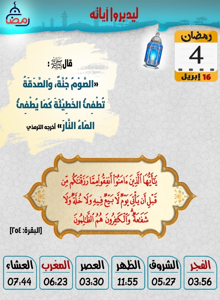 مواقيت الصلاة وموعد آذان المغرب الجمعة 4 رمضان  ..ليدبروا آياته