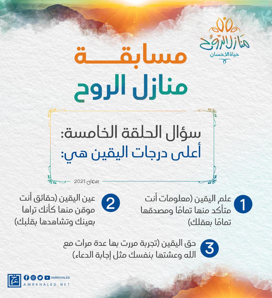 مسابقة برنامج "منازل الروح" للداعية الإسلامي الدكتور عمرو خالد رمضان 2021متواصلة على مدار الشهر الكريم، ومكونة من 30 سؤالاً (كل يوم سؤال)، ومفتوحة لكل الأعمار والفئات.