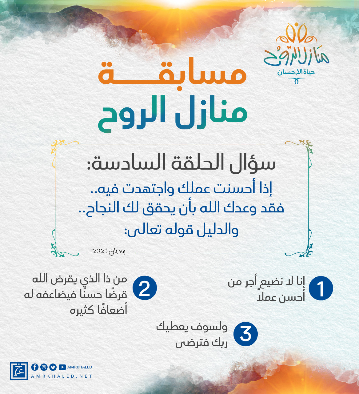 مسابقة برنامج "منازل الروح" للداعية الإسلامي الدكتور عمرو خالد رمضان 2021متواصلة على مدار الشهر الكريم، ومكونة من 30 سؤالاً (كل يوم سؤال)، ومفتوحة لكل الأعمار والفئات.