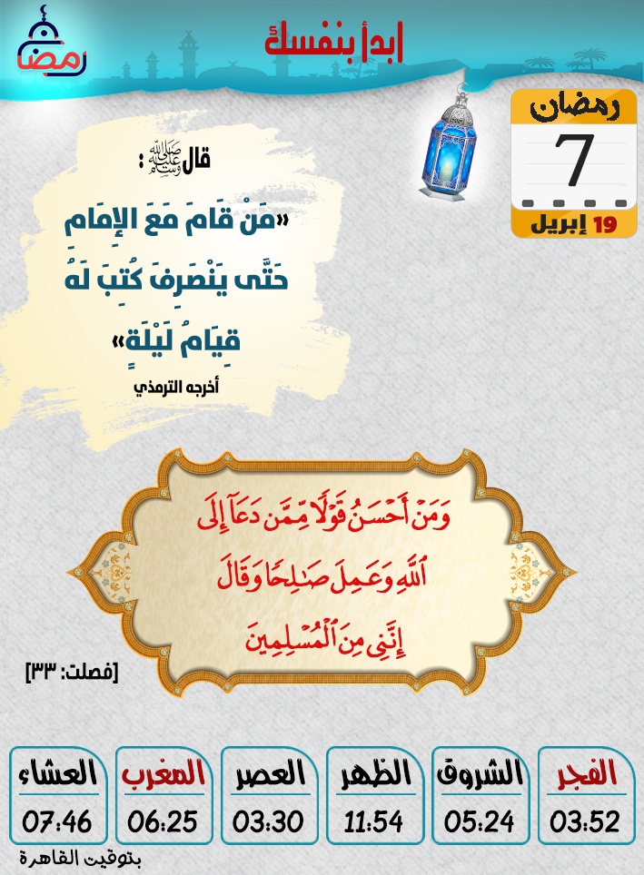 مواقيت الصلاة وموعد آذان المغرب الاثنين 7 رمضان  ..ابدأ بنفسك