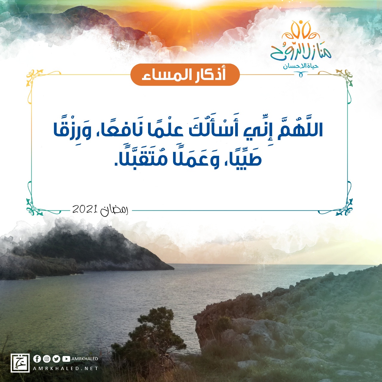 amrkhaled "اللهم أني أسألك علما نافعا ورزقا طيبا وعملا ومتقبلا" من قالها حين يمسي أفاض الله عليه الخيرات العظيمة
