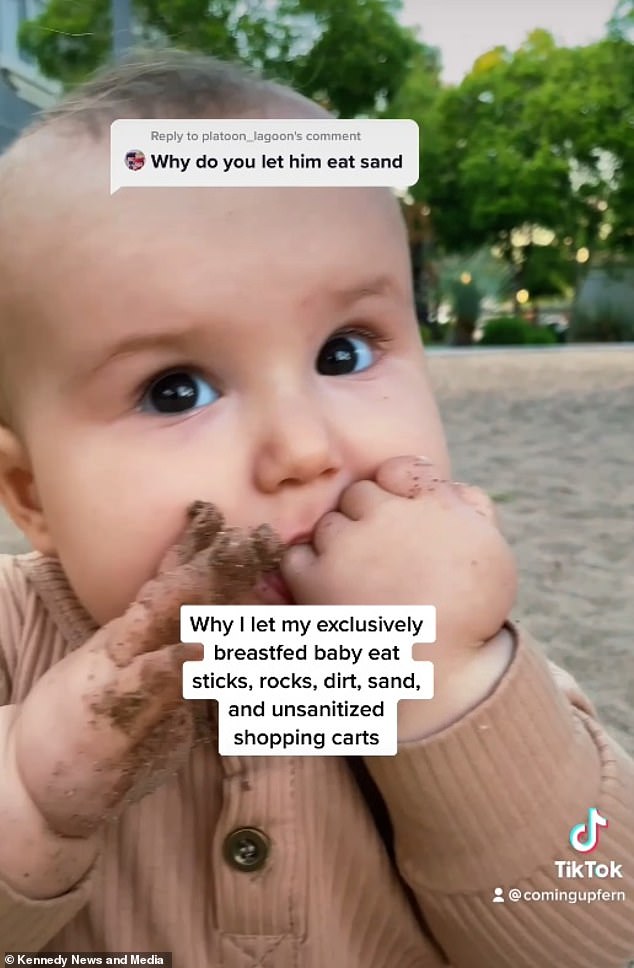 شاركت امرأة أمريكية، مقطع فيديو على تطبيق "تيك توك" لطفلها الرضيع البالغ من العمر ثمانية أشهر وهو يمضغ أشياء مختلفة، أثناء تواجده على الشاطئ، من بينها الرمل والأوساخ والصخور، وحتى أحزمة عربة التسوق في السوبر ماركت، حيث تدعي أن حليب ثديها يحمي الطفل، بينما هذه الأشياء "تبني جهازه المناعي".