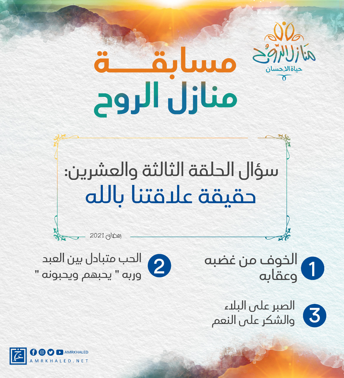مسابقة برنامج "منازل الروح" للداعية الإسلامي الدكتور عمرو خالد رمضان 2021متواصلة على مدار الشهر الكريم، ومكونة من 30 سؤالاً (كل يوم سؤال)، ومفتوحة لكل الأعمار والفئات.