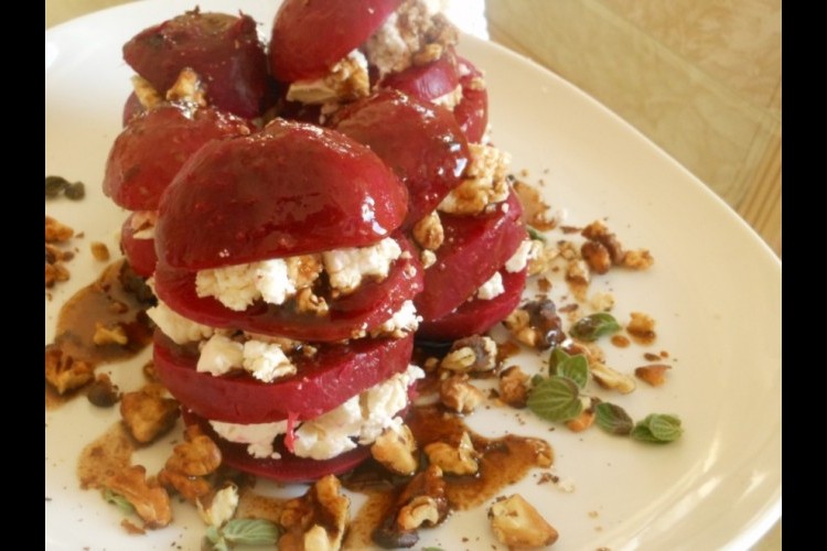 2- في صحن التقديم نضع شريحة بنجر ثم القليل من الجبنة الفيتا ثم قطعة بنجر وهكذا لتنتهي الحبة ونكمل ببقية البنجر، ثم ننثر عين الجمل المحمص على الصحن حول البنجر المحشي ثم الزعتر والصوص.اقرأ أيضا: