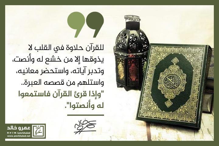 amrkhaled "للقرآن حلاوة في القلب لا يذوقها إلا من خشع له وأنصت، وتدبر آياته، واستحضر معانيه، واستلهم من قصصه العبرة.. {وإذا قرئ القرآن فاستمعوا له وأنصتوا}".