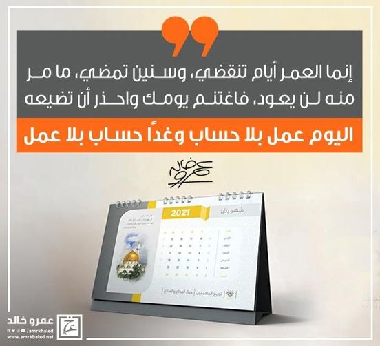 "إنما العمر أيام تنقضي، وسنين تمضي، ما مر منه لن يعود، فاغتنم يومك واحذر أن تضيعه.. اليوم عمل بلا حساب وغدًا حساب بلا عمل".