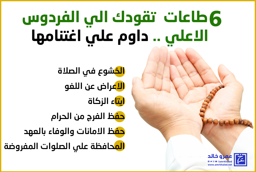amrkhaled هناك طاعات تقود العبد المؤمن الي جنات عدن والفردوس الأعلي منها الخشوع في الصلاة والإعراض عن اللغو ايتاء الزكاة وحفظ الفرج من المحرمات وحفظ الأمانات