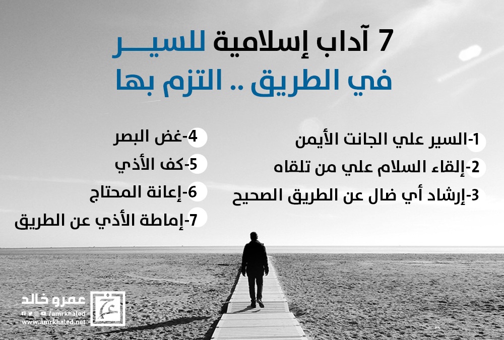 amrkhaled هناك آداب إسلامية للسير في الطريق منها السير في الجانب الأيمن والقاء السلام علي من تلقاه وغض البصر وكف الأذي وإعانة المحتاج وإرشاد الضال وإماطة الأذي