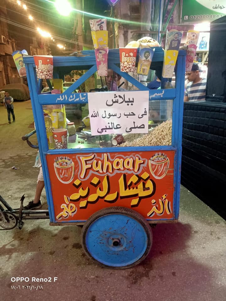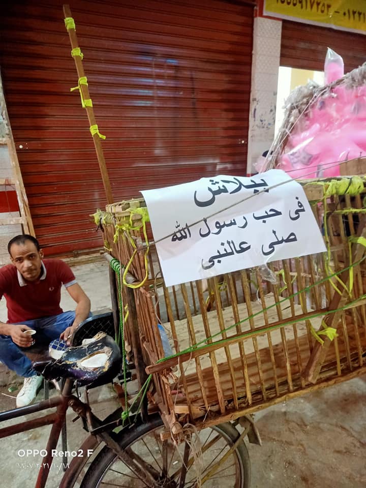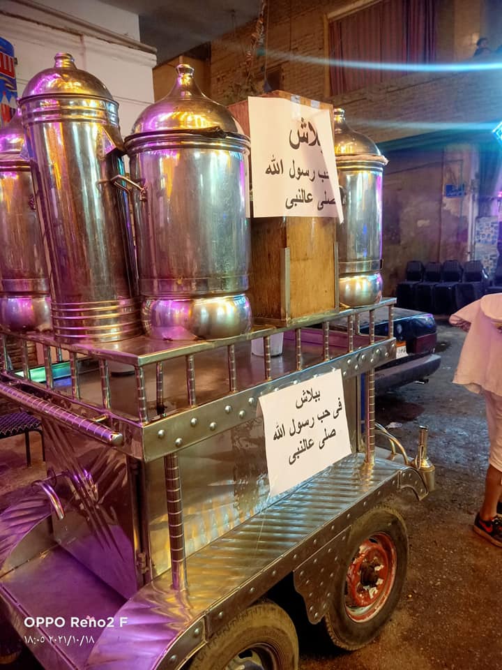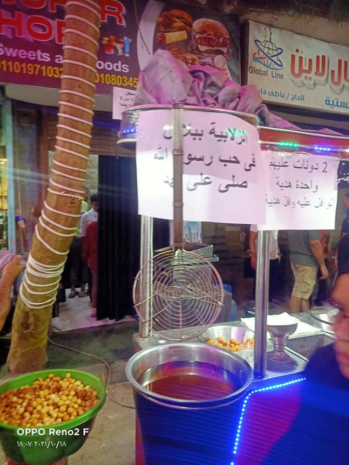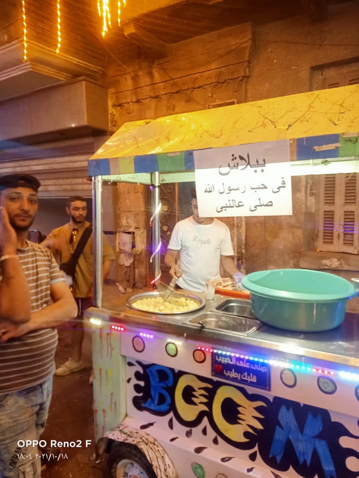 وفي منطقة الشرابية بالقاهرة، بادر أحد الأهالي إلى توزع الذبائح والطعام بالمجان حبًا في النبي صلى الله عليه وسلم، حيث أظهرت صور متداولة على منصات وسائل التواصل الاجتماعي، عربات مخصصة لبيع "الكسكسي" و"الزلابية" و"الفيشار" وحلوى "غزل البنات" و"البطاطا"، تحمل لافتات كتب عليها: "ببلاش في حب رسول الله صلى الله عليه وسلم".