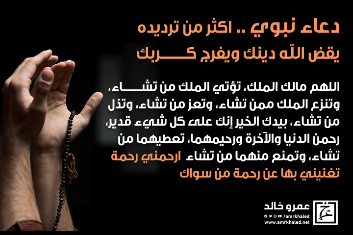 "اللهم مالك الملك، تؤتي الملك من تشاء، وتنزع الملك ممن تشاء، وتعز من تشاء، وتذل من تشاء، بيدك الخير إنك على كل شيء قدير، رحمن الدنيا والآخرة ورحيمهما، تعطيهما من تشاء، وتمنع منهما من تشاء ارحمني رحمة تغنيني بها عن رحمة من سواك"