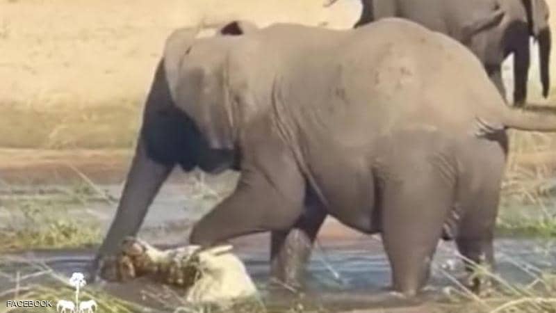 وظهر التمساح، الذي يبدو أن طوله يتراوح بين 8 و10 أقدام وحاول أن يفتك بصغيرها (الدغفل)، وهو يندفع في المياه الضحلة بينما تستمر أنثى الفيل في سحقه، وبعد دقيقة، ظهر وأن أنثى الفيل تمسك بالتمساح من ذيله، فيما باقي جسمه تحت الماء.