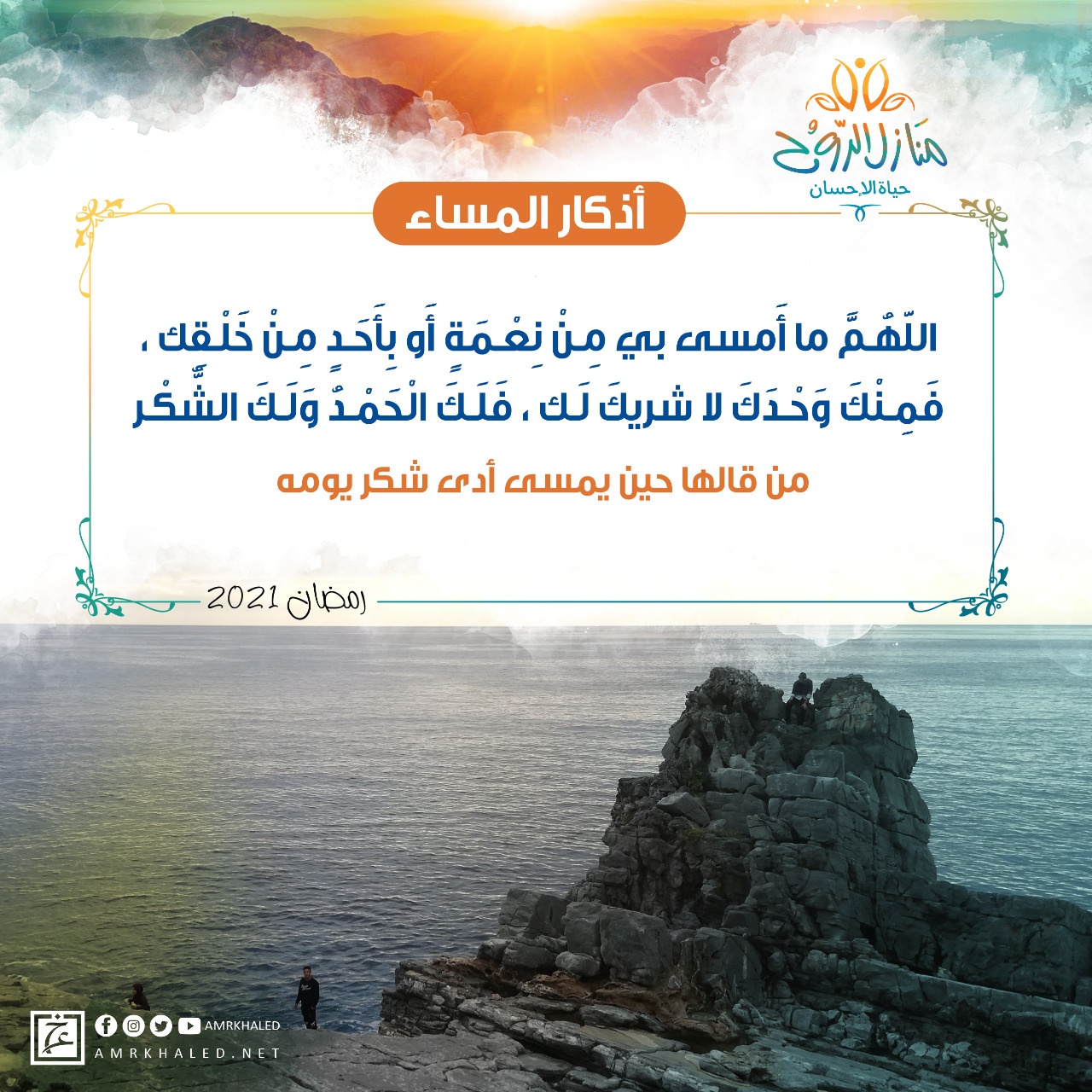 amrkhaled "اللهُم ما أمسى بي من نعمة أو بأحدٍ من خلقك فمنك وحدك لا شريك لك فلك الحمد ولك الشُكر"..من قالها حين يمسي فقد أدي شكر يومه