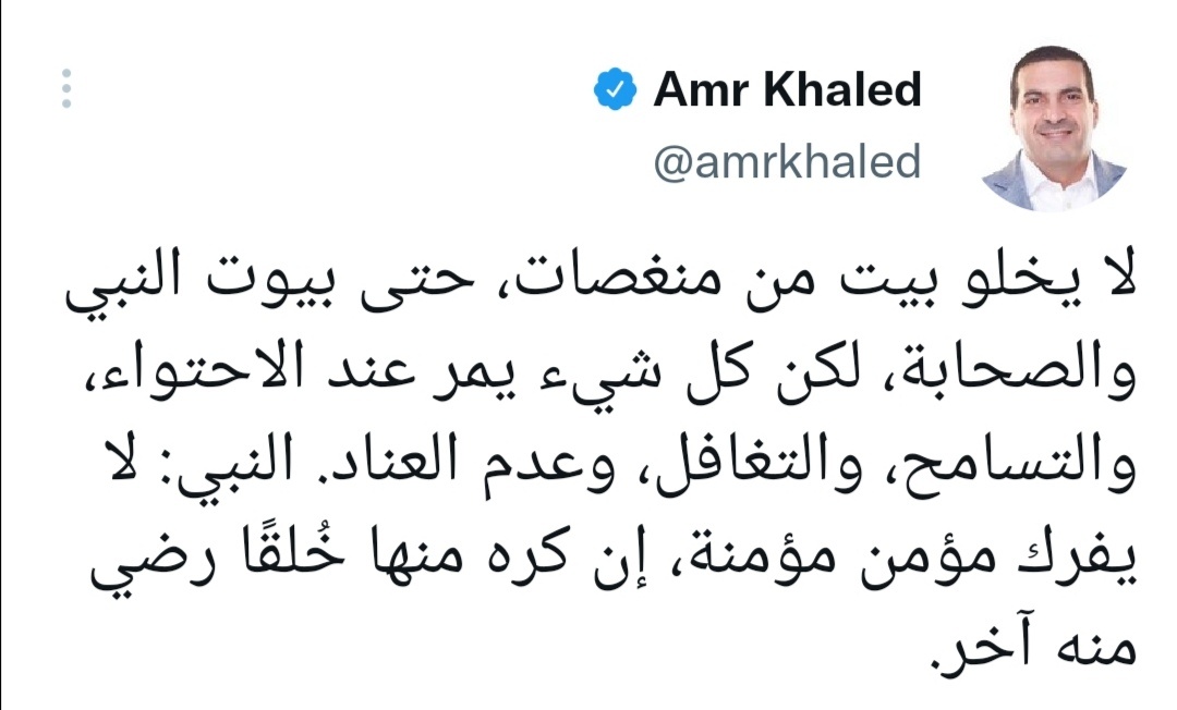 amrkhaled "لا يخلو بيت من منغصات، حتى بيوت النبي والصحابة، لكن كل شيء يمر عند الاحتواء، والتسامح والتغافل، وعدم العناد.. النبي: لا يفرك مؤمن مؤنة، إن كره منها