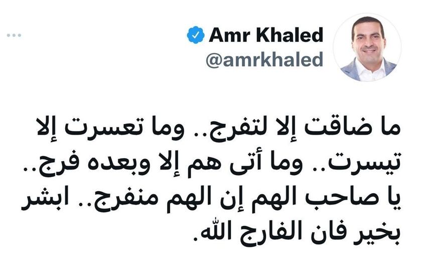 amrkhaled "ما ضاقت إلا لتفرج.. وما تعسرت إلا تيسرت.. وما أتى هم إلا وبعده فرج.. يا صاحب الهم إن الهم منفرج.. ابشر بخير فإن الفارج الله"