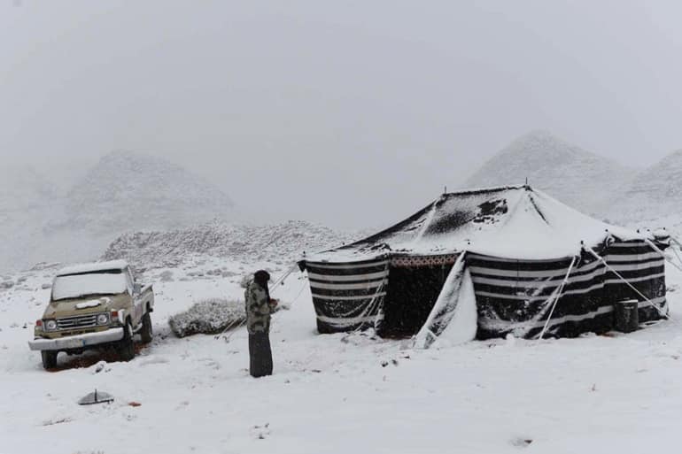 وشهدت المنطقة مؤخرا هطول أمطار وانخفاض شديد في درجات الحرارة ليتهاطل بعد ذلك الثلج.