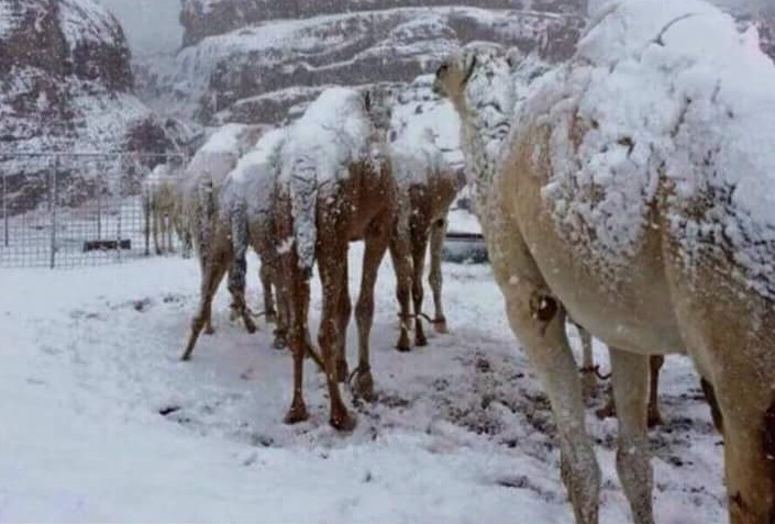 تداول نشطاء مواقع التواصل الاجتماعي مقطع فيديو، مشهدًا مذهلًا للإبل وهي تسير بين الضباب والثلوج في مدينة تبوك بشمال المملكة العربية السعودية خلال الساعات الماضية.