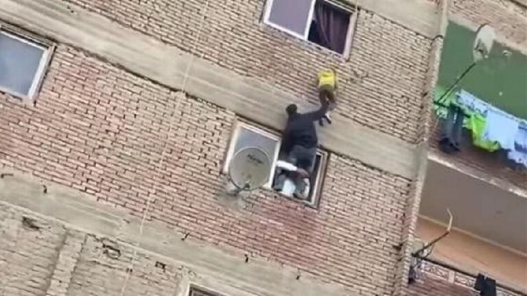 ووثق أحد الحاضرين لحظة إنقاذ الطفل، حيث ظهر طفل صغير يتشبث بشرفة شقة في الدور الثالث فيما صعد شاب من نافذة الطابق الثاني وأمسك الطفل من قدميه بكل قوة وسحبه إلى الأسفل.