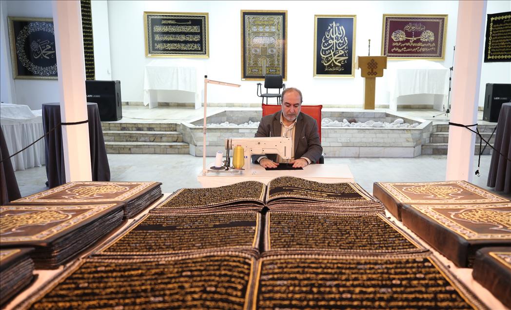 وأوضح أن غلاف المصحف استغرق عامين أيضًا، لأنه مشغول بطريقة يديوية تمامًا، على نفس صناعة ثوب الكعبة (السيرما النافر)، ونفذته يدويًا على الماكينة، والكتابة دون رسم مسبق على القماش، والمجلد الواحد من المصحف قياسه 60& 80 سنتميترًا.