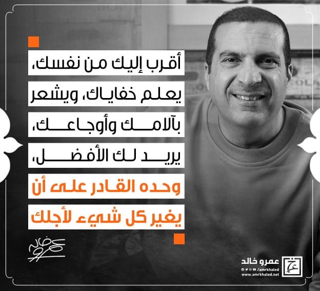 amrkhaled "أقرب إليك من نفسك، يعلم خفاياك، ويشعر بآلامك وأوجاعك، يريد لك الأفضل، وحده القادر على أن يغير كل شيء لأجلك".