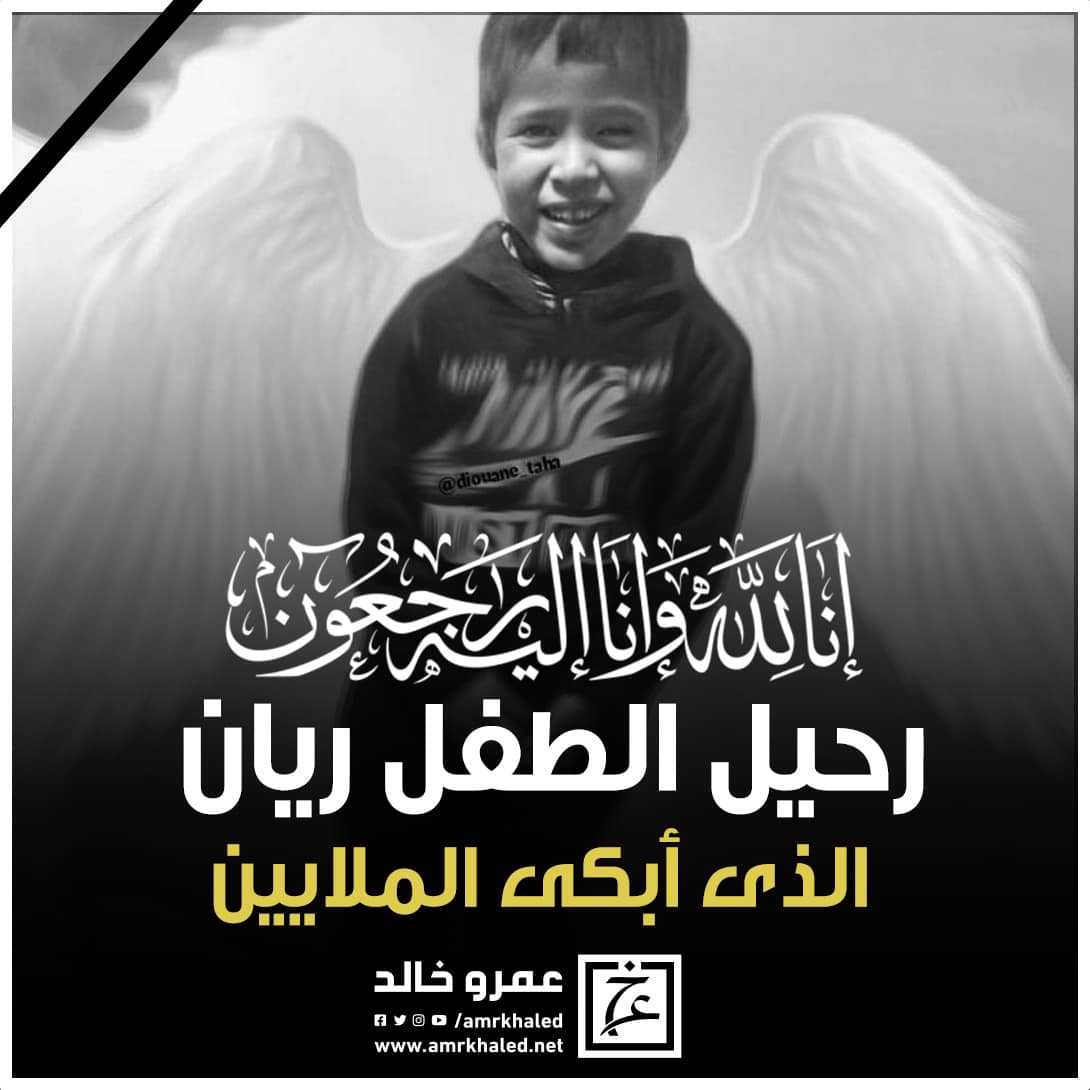 الطفل ريان المغربي فور خروجه من البئر الذي سقط فيه منذ عدة أيام والذي يبلغ عمه 54 مترًا تحت الأرض، داعيا المولى عز وجل أن يربط على قلب والديه واجمع بينهما في الفردوس الأعلى.وقال "خالد" "إن العين لتدمع وإن القلب ليحزن وإنا على فراق "ريان" لمحزنون"، مضيفا "تلقيت كما الملايين بمزيد من الحزن والأسى نبأ وفاة الطفل المغربي ريان، الذي تعلقت به قلوب الملايين بعد محاولات مضنية لإخراجه من البئر العميق الذي انزلق إليه قبل أيام.وتابع الداعية الإسلامي "أسأل الله أن يربط على قلب والديه، وأن يكون ذخرًا لهما في الجنة.. اللهم اربط على قلب والديه واجمع بينهما في الفردوس الأعلى.. وداعًا الطفل البرئ الذي أبكى الملايين".وكان التلفزيون المغربي الرسمي قد أعلن وفاة الطفل ريان بعد جهود مضنية حاولت فيها فرق الإنقاذ إخراجه من البئر التي مكث فيها لمدة 5 أيام.