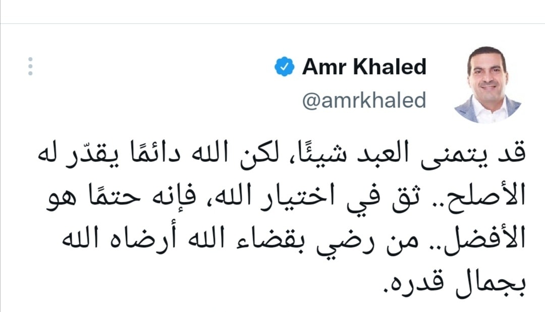 amrkhaled "قد يتمنى العبد شيئًا، لكن الله دائما يقدر له الأصلح.. ثق في اختيار الله، فإنه حتمًا هو الأفضل.. من رضى بقضاء الله أرضاه الله بجمال قدره"