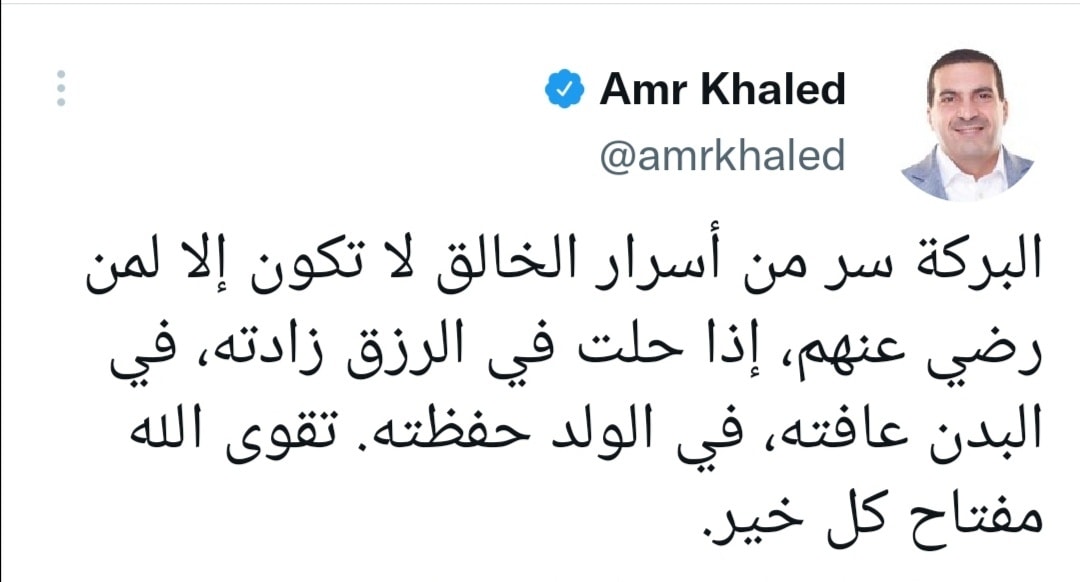 amrkhaled "البركة سر من أسرار الخالق لا تكون إلا لمن رضي عنهم، إذا حلت في الرزق زادته، في البدن عافته، في الولد حفظته.. تقوى الله مفتاح كل خير"