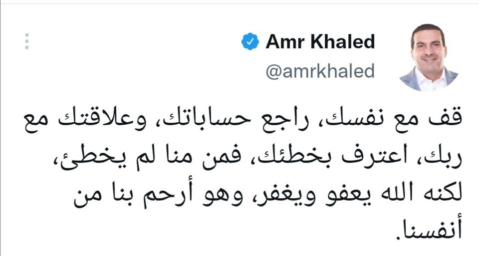 amrkhaled "قف مع نفسك، راجع حساباتك، وعلاقتك مع ربك، اعترف بخطئك، فمن منا لم يخطئ، لكن الله يعفو ويغفر، وهو أرحم بنا من أنفسنا".