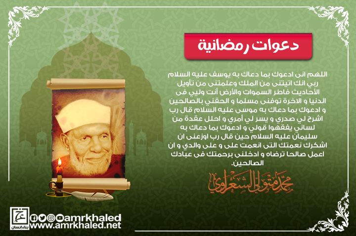 اللهم إني أدعوك بما دعاك به يوسف عليه السلام: ربي أنك آتيتني من الملك وعلمتني من تأويل الأحاديث فاطر السموات والأرض، أنت وليي فى الدنيا والآخرة توفنى مسلمًا وألحقتي بالصالحين، وأدعوك بما دعاك به موسى عليه السلام، قال رب اشرح لي صدري ويسر لي أمري، واحلل عقدة من لساني يفقهوا قولي، وأدعوك بما دعاك به سليمان عليه السلام حين قال رب أوزعنى أن أشكرك نعمتك التي أنعمت علي وعلى ولدي وأن أعمل صالحًا ترضاه وادخلني برحمتك في عبادك الصالحين.