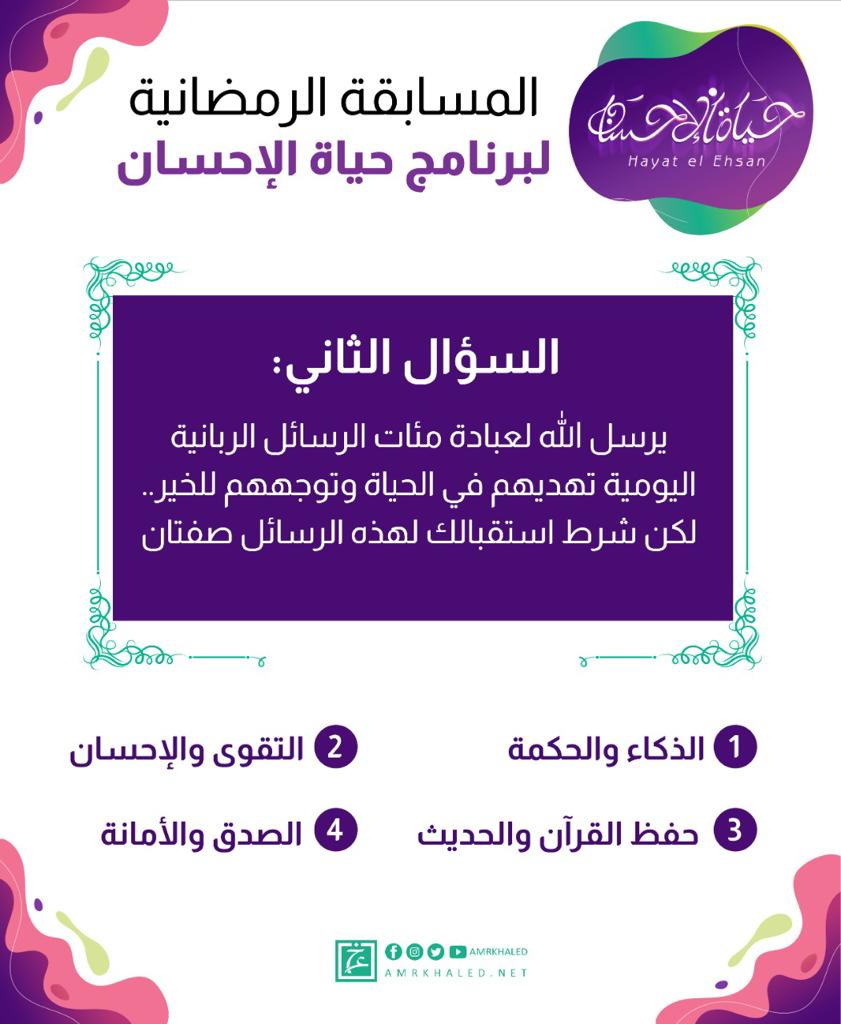 مسابقة برنامج "حياة الإحسان" للداعية الإسلامي الدكتور عمرو خالد رمضان 2022 متواصلة على مدار الشهر الكريم، ومكونة من 30 سؤالاً (كل يوم سؤال)، ومفتوحة لكل الأعمار والفئات.