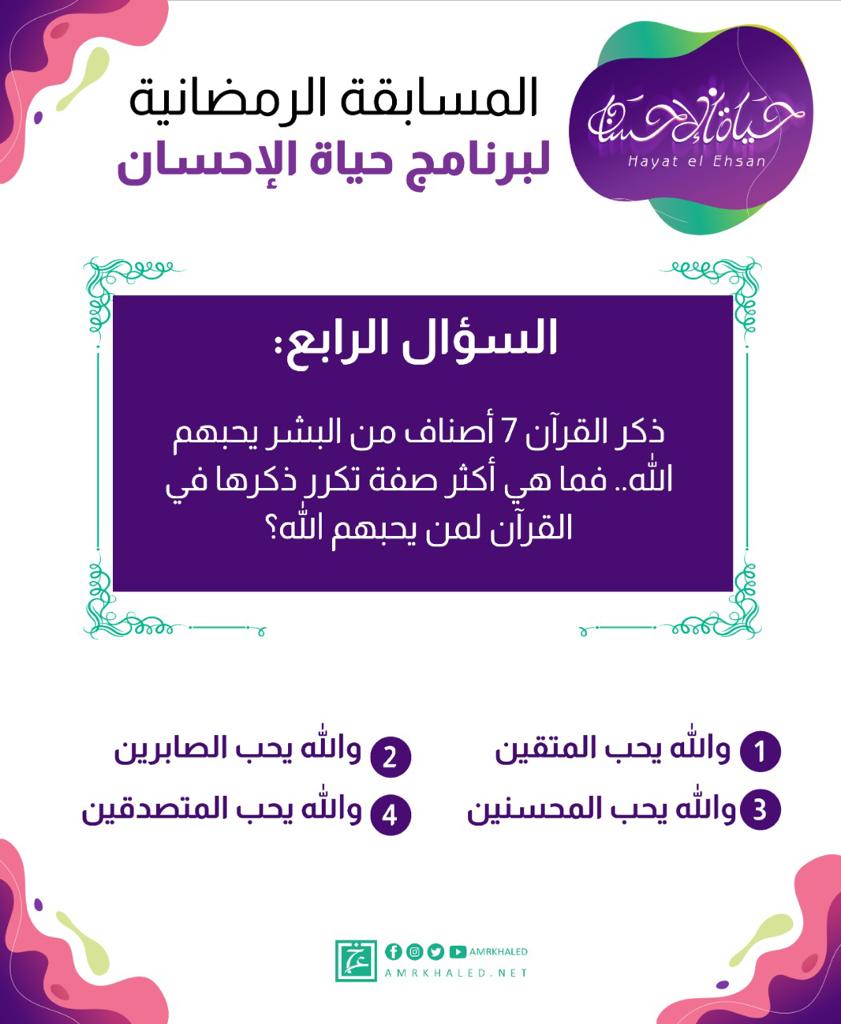 مسابقة برنامج "حياة الإحسان" للداعية الإسلامي الدكتور عمرو خالد رمضان 2022 متواصلة على مدار الشهر الكريم، ومكونة من 30 سؤالاً (كل يوم سؤال)، ومفتوحة لكل الأعمار والفئات.